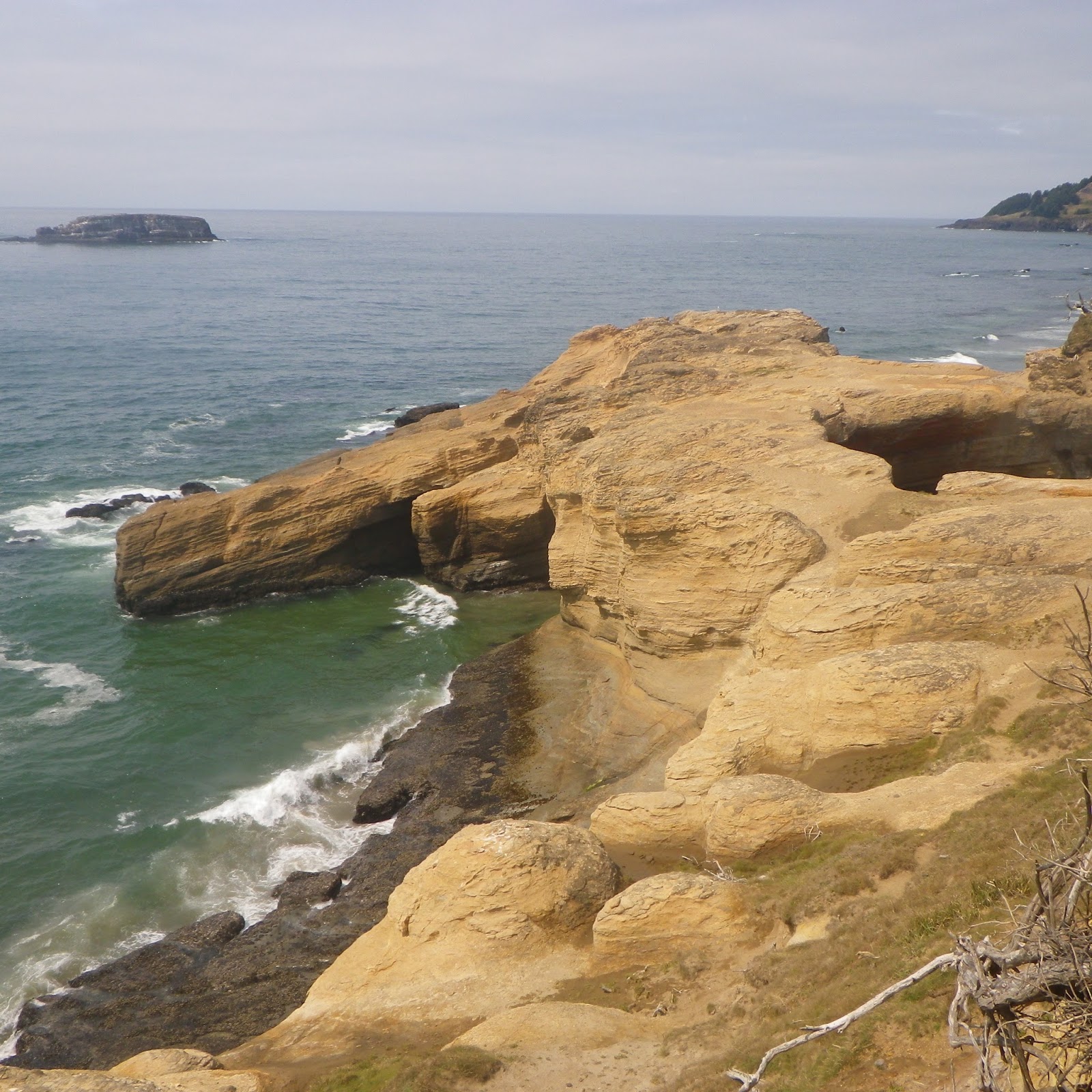 We headed out around 8am to see some water falls that were about 2 miles from the Bunk house. The car was packed, and we were going to head to highway 101 after that. We saw Bar falls and Mill Creek falls. They were really pretty and about a 1m tops walk. After that we headed back to 65 and we got about a mile past the bunk house when we heard strange sounds like a flat. We discovered loose rubber coming off our front right tier… We cut it off and called the guy, Jim, that we had rented the house from and had talked to the previous night. He said we should go to a auto shop that was about 35 miles away, and I though I knew where he was talking about. He also said we could bring it back to their house and he would change it, but we only had a mini tier, so we would still have to goto the auto shop…SO, we headed out to find the car shop… we kept loosing time on our ETA, it was sad… Finally, we did not find it, and we stopped looking. We took it to walmart to find that you should not keep driving cars with missing rubber and that all FOUR of the tires were ready to blow. We got our shopping done, and by the time we were ready so was the car… The mechanics could not believe that the car had been in such bad condition… Finally we were on our way, and instead of stoping leisurely at different places along the way we had to go right to our house to save time, we had lost 3 hours on the tires, it was sad. We arrived at our beach house a vacation by owner home around 4:45PM, un packed, settled in and walked to town for dinner. We ended up eating at Drive Wood Inn, they had pizza, and a lot of other things that looked good, but we had pizza. It was good… Hit the spot. We walked back to the house and were in bed around 10pm. We all got up around 6:30am, had everything bagels with egg, cheese and bacon as well as coffee for breakfast, got ready, and were at the sea lion caves before 9am. We ended up not seeing a lot of sea lions, just a few swimming around, the caves were empty, but it was still cool. They built an elevator 300ft down to the cave, and had a really cool viewing area… We got a few souvenirs at the gift shop, and some pop corn and headed down high way 101 again to Florence. At florence we found a little farmers stand and got a lot of fruit… One was a plumb peach hybrid that was so sweet it tasted like candy to me. After that we walked down the dock and saw a couple seals swimming and a lot of tinny jelly fish.. Then we walked down the street to a few little shops, one was full of local artists work, and Debi got a cool dragon fly neckless, I got a bracelet, and mom got a cute little starfish. We got coffee at a local shop after that, they put scoops of our choice of coffee grains on top of our cups and filtered it in with hot water, it was really good. AND they had a bible question, if you answered it right you got free coffee… Debi got the question right first after we got a hint…